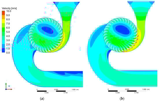 A series of CFD 2D simulations were then performed. The geometrical parameters of the two different UL-PRS turbines are shown in Table 2. Both turbines were solved assuming the same flow rate Q, but the rotational velocity and width W were changed in each simulation to maintain the optimality conditions according to the different possible heads ΔH. The optimality conditions and the corresponding design criteria can be found in [9,10,11,12,13]. Observe that the blade maximum thickness tmax in the last row is selected according to [13] to guarantee structural safety and maintain high hydraulic efficiency.