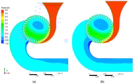 In the case of an ultra-low hydraulic head, i.e., ΔH ≤ 3 m [7], the traditional PRS diffuser still provides good efficiency values but has a vertical outlet flow and shows a sharp efficiency reduction close to the minimum head values. See in Figure 3 the efficiencies computed with several PRS machines designed using different head values, but the same flow rate (Q = 0.840 m3/s), the same velocity ratio (Vr = 1.8) and the same rotor outer diameter (D = 913 mm). The efficiencies are defined as follows [14]: