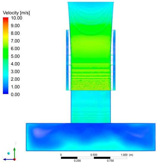 A comparison between the velocity fields in the symmetry plane of the 3D simulation (Figure 13a) and the 2D simulation (Figure 13b) shows a good match for the accuracy required by the proposed UL-PRS design approach, except for the last part of the diffuser, whose width increases with a hyperbolic law in the 3D model, whereas it is constant in the 2D analysis.