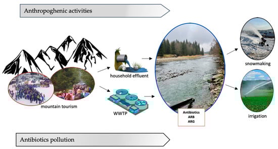 Mountain rivers provide water for the production of artificial snow to ensure snow cover on ski slopes in the winter season and for irrigation of green areas in the summer season. Mountain river water is also used by households to irrigate their crops. The use of water contaminated with antibiotics, drug resistance genes, or antibiotic-resistant bacteria results in further transmission of these micropollutants into the environment, thereby increasing the risk of spreading drug resistance and endangering public health (Figure 1).