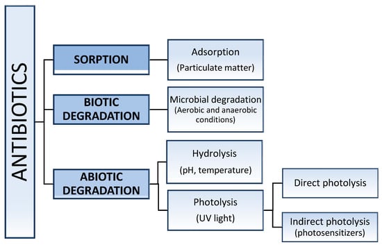 Antibiotic degradation rates are important for predicting their environmental exposure and impact on bacterial populations. Antibiotics dissolved in water undergo physicochemical modifications caused by biotic and abiotic factors that affect their structural stability. The following processes affect the stability of antibiotics in surface water: hydrolysis, photolysis, sorption, and biological degradation [,,,,]. The occurrence of these processes depends on environmental conditions such as sunlight, water temperature, the abundance of microorganisms, water chemical composition, sediment properties, and organic matter content. Predicting the degradation pathways of antibiotics is essential for assessing their fate in the environment. The natural degradation pathways of antibiotics in water environments are presented in Figure 2.