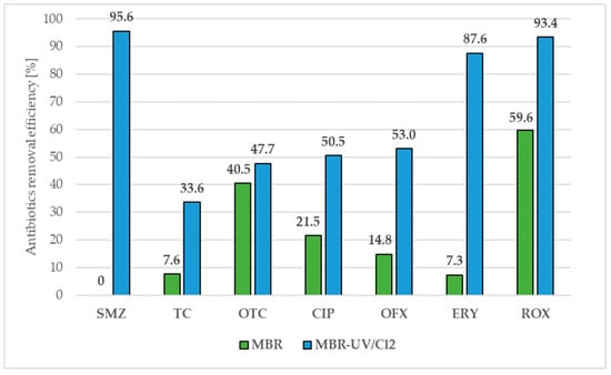 Antibiotic removal efficiency by MBR and MBR-UV/Cl2 processes []. SMZ—sulfamethoxazole, TC—tetracycline, OTC—oxytetracycline, CIP—ciprofloxacin, OFX—ofloxacin, ERY—erythromycin, ROX—roxithromycin.