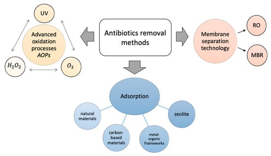 A variety of research has reported that MBR systems applying ultrafiltration are partially successful in the removal of antimicrobial agents from wastewater [,,,]. Advanced techniques combined with MBR treatment, in particular UV radiation, activated carbon, advanced oxidation processes (AOPs), and adsorption methods (MOFs, zeolites, natural materials) (Figure 4), have the potential to be developed as effective technologies in treating wastewater and surface water polluted with antibiotics. The MBR process yields treated effluent of a quality that allows it to be discharged into sensitive water bodies (such as mountain rivers) or reclaimed in a variety of ways (including the production of artificial snow). Due to its compact size, it can be used for municipal sewage treatment and can be successfully applied in places where saving space is an important trait (such as mountain hotels, shelters, etc.). It overcomes the drawbacks of conventional activated sludge processes, including large space requirements for secondary clarifiers and production of excess sludge [,]. The application of advanced wastewater treatment methods offers great prospects for the economical reuse of wastewater free of micropollutants such as antibiotics. Reducing the content of antibiotics in wastewater will decrease the supply of these compounds to the environment after the discharge of treated wastewater. This will reduce the risk of developing drug resistance among microorganisms in the environment and other adverse environmental effects.