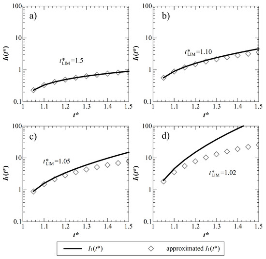 To determine the limit of applicability of the proposed approximation, it is convenient to introduce the non-dimensional time, defined as . Using these non-dimensional quantities, Equation (13) can be written as: