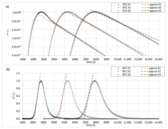The validity of the approximations derived above is tested on an ideal case, by (i) simulating a BTC from a TSM model using previously fixed , , , and , and (ii) plotting the approximation lines obtained from the Equations (10), (11), (18) and (21). The flow discharge is assumed to be m3 s−1 with stream width and depth m, respectively. The dispersion coefficient is estimated using Fischer’s formula, m2s−1 [45], where the shear velocity is m s−1 and is the energy slope under the assumption of uniform flow and given a Manning coefficient m−1/3s−1. The model output is generated using a single compartment TSM with storage area m2, and exchange rate s−1 at three cross-sections located at m, m and m from the injection point. The boundary condition at is a constant concentration injection of a solute mass g, applied for a period s starting at s.
