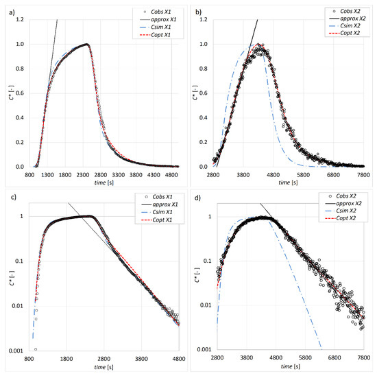 Normalized observed concentration data (“Cobs”, circles), the approximating trendlines (solid black lines), the simulated BTCs from the approximations (“Csim”, dashed-dot blue lines) and the optimized simulated BTCs (“Copt”, dashed red lines), for section X1 (panels (a) and (c) and section X2 (panels (b) and (d)). Panel (a) and (b) refer to the approximation of the rising limb of the BTC. Panel (c) and (d) are in semi-log scale and refer to the approximation of the decreasing part of the BTC.