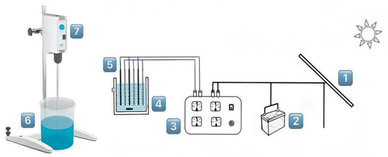 As shown in Figure 1, in the EC process, iron electrodes were utilized as sacrificial electrodes due to their low cost and ease of access. Six electrodes were dipped in a solution to a depth of 6 cm with a spacing of 4 cm between the electrodes. Plastic spaces were used to adjust the electrode and maintain the electrodes vertically parallel. Three electrodes were used as cathodes, while the remaining three electrodes were used as anodes. All the electrodes were rectangular with dimensions of (9 cm × 6 cm × 1 mm) with circular holes. The electrodes that were immersed in the pharmaceutical wastewater solution had a total effective surface area of approximately 644.08 cm2. The source of power supply was a monocrystalline silicon photovoltaic panel (PS-M36S-90, Philadelphia Solar Co., Amman, Jordan) (HACH DRB200, Hach Company, Japan) with a maximum power of 90 watts used with a charge controller and regulator, (10A 12V/24V 240W), Future Electronics, Cairo, Egypt. Normal wires of 1.5 mm were used to connect the electrodes in a monopolar parallel, and PVC was used to isolate them. A battery (NPP 12-5.0 12V5.0Ah/20HR, NPP Power Co., Ltd., Guangzhou, China) was installed to store energy, and a Digital potentiometer voltmeter (Drok YB27VA, Robu Co., Guangzhou, China) to regulate the current.