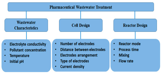 As shown in Figure 2, the parameters affecting the performance of the EC process include the wastewater properties such as pollutant concentration, pH, temperature, and conductivity. On the other hand, the operational parameters include the type, number arrangement of the electrodes and the distance between them, current density and reaction time.