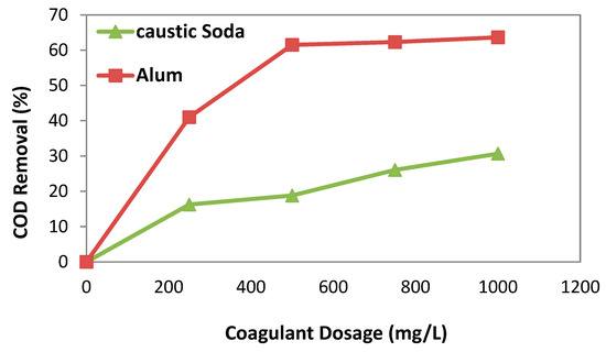 According to Figure 3 and Table 2, the COD removal value was 26% at the optimal dosage of 750 mg/L of NaOH for COD removal, while the COD removal value was 61.5% at the optimum dosage of 500 mg/L of alum for COD removal. However, COD removal efficiencies were higher at 1000 mg/L alum and 1000 mg/L NaOH, with 63.6% and 30.7% COD removal, respectively. In addition, it was shown that the removal efficiency of COD increased slowly when the alum dosage was greater than 500 mg/L. This indicates that it is not necessary to add more alum than 500 mg/L. A similar trend was reported by Maleki [51] and Bouchareb [56], where alum had an advantage over other chemicals and showed the best removal efficiencies for COD. In general, increasing the coagulant dosage increased the efficiency of COD removal by coagulant.