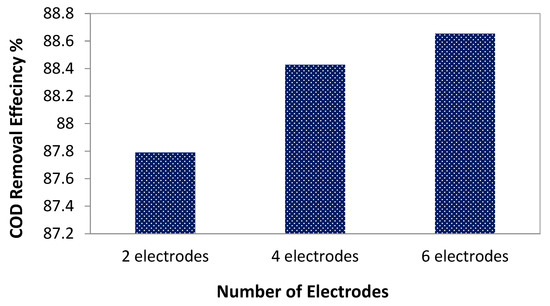 As a parameter for the treatment of pharmaceutical wastewater, the effect of the number of electrodes on the removal efficiency of COD was studied. In this study, different numbers of electrodes (two, four, and six electrodes) were used with the following operating conditions: a pH of 7, a distance between electrodes of 4 cm, an operating time of 20 min, and an MP-P electrode configuration. In Figure 4, the relationship between the electrode numbers and the COD removal efficiency of pharmaceutical wastewater after the EC process is shown.