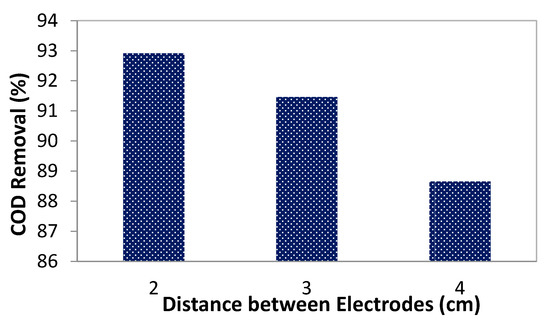 As shown in Figure 5, the removal efficiency of COD in the EC process decreases slightly when the distance between electrodes increases due to the slower rate of electron transfer. It was observed that the COD removal efficiency decreased (from 88.7 at 4 cm to 92.9 at 2 cm) the distance between electrodes. The potential (V) increases together with the increase in distance between the electrodes. As a result, resistance increases and has a negative impact on pharmaceutical wastewater treatment. These outcomes are consistent with those attained by Salih Muharam [61], Janpoor [62], Nasrullah [63], and Bhagawan [64].