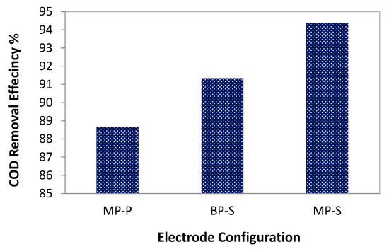 Figure 6 shows the effect of electrode configuration on the removal efficiency of COD using the EC process. It was observed that the highest COD removal efficiency was with the MP-S configuration compared to the BP-S and MP-P configurations, which increased from 88.7% to 94.4%. The COD removal efficiency reached a maximum of 94.4% with the MP-S configuration. In a study conducted by Kobya [65] and Naje [66], it was discovered that the MP-S electrode connection mode in the EC process removed more arsenic than other electrode connection modes.