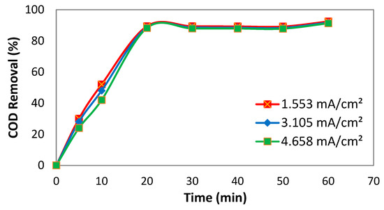 As shown in Figure 7, the removal efficiency of COD increases at a relatively high rate during the first 20 min, then decreases, and reaches a maximum removal efficiency of COD after 60 min of reaction time. Figure 7’s findings indicate that a reaction time of 20 min is sufficient for nearly complete COD treatment efficiency. After 20 min, treatment efficiency shows an insignificant improvement due to the passivation layer on the electrode material. Therefore, the optimum reaction time was 20 min when the removal efficiencies for each (1.553, 3.105, and 4.658 mA/cm2) at 20 min reached about 89.4%, 88.7%, and 88.3%, respectively. These outcomes are consistent with those attained by Janpoor [62], Nasrullah [63], and Bhagawan [64]. The COD removal efficiency did not increase as the CD was increased, but it did decrease slightly when the CD was increased (from 1.553 to 4.658 mA/cm2) at 20 min (from 89.4 to 88.3%), which could be attributed to the passivation layer on the electrode material.