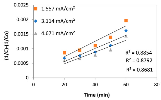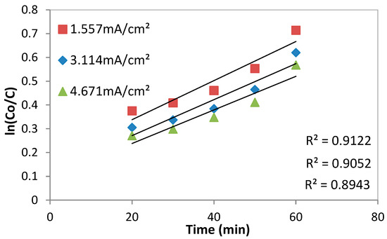The first-order kinetic model can successfully simulate the removal efficiency of COD in the EC at various CD because the data are well correlated (higher R2). According to Table 5, when the current density increases, the first-order kinetic constant decreases, and the maximum kinetic rate is 0.00822 (min−1) at 1.553 mA/cm2, showing the maximum removal efficiency.