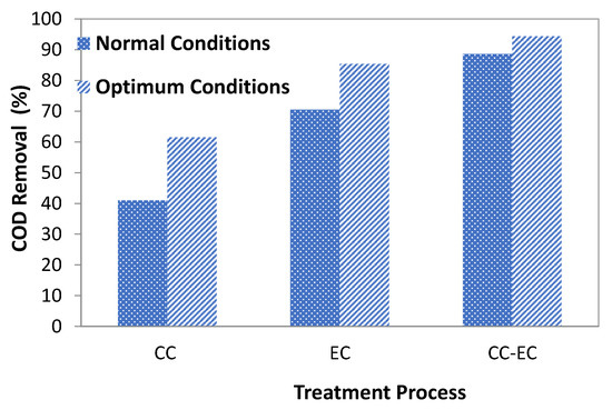 The results were used to compare the performance of CC, EC, and combined CC-EC in COD removal from pharmaceutical wastewater under optimum conditions of 500 mg/L of alum dosage, 3.105 mA/cm2 of current density, six electrodes with a distance of 2 cm between electrodes, and MP-S electrode configuration. On the other hand, the results of normal conditions of 250 mg/L of alum dosage, 1.553 mA/cm2 of current density, four electrodes with a distance of 4 cm between electrodes, and MP-P electrode configuration are shown in Figure 10.