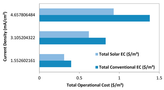 One more parameter that affects the applicability of the EC process is energy consumption. It is clear from the literature that most electrocoagulation research has relied on conventional electrical power sources, which are notorious for their high-energy consumption, lengthy treatment durations, and excessive sludge production. In some regions, such as remote towns with limited access to the energy grid, a wastewater treatment system is difficult to power with a conventional electric power source [42]. Photovoltaic (PV) energy has many advantages, including low fossil fuel consumption, low carbon dioxide emissions, free usage, a long service life, low maintenance costs, and no pollution [43,44]. This research focused on the capability of a solar PV energy source to eliminate COD from pharmaceutical wastewater. The employment of the EC method as a single treatment method might impose significant practical limits, particularly if the wastewater is extremely contaminated; thus, there is a need for treatment methods that are effective. As a result, using the EC in conjunction with a pre or post-treatment method will improve its performance [40,41,42,43,44,45,46]. Several studies have been conducted regarding the combination of EC with other technologies, such as biological treatments and chemical coagulation (CC) [47,48,49]. Combining techniques can improve the treatment performance while potentially saving energy and potential costs. Combining CC and EC processes can optimize treatment by shortening separation times and reducing generated sludge water content as well as streamlining the sludge dewatering process [47,48,49].