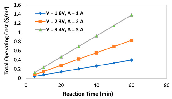 As mentioned above, this study used iron (Fe) as an electrode material. According to the following chemical reactions, ferric hydroxide is formed according to chemical Equations (1)–(3), and then, it acts as a coagulant for the pollutants found in the wastewater [50]: