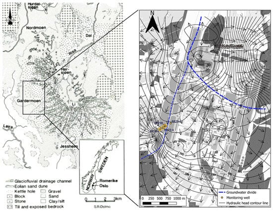 The Gardermoen glacial-contact delta (Figure 1) is an aquifer composed of unconsolidated sand with beds of gravel underlain by silty glaciomarine deposits [7,8,9]. Coarser sediments are dominating in the north-eastern parts of the aquifer, consistent with ice contact, while there is a fining of the sediments towards the distal part of the delta, towards the west and the south. In the deeper layers (bottom set), there is a higher proportion of fine sediments, silt, and clay. The ravines in the southwest are formed in the clayey marine sediments deposited when the Romeriksfjord was at the level of the glacial delta about 10,000 years ago. Today, the Gardermoen delta and the runways are situated 202 m above the current sea level, caused by isostatic uplift.