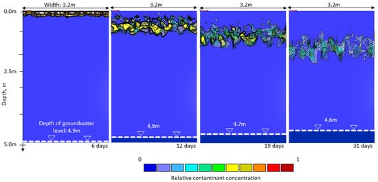 The model is run for one year to reach a stable hydraulic gradient. A gradient of 1/150, similar to the measured gradient, is obtained. After steady state conditions are established, an inactive tracer with a concentration of 100 mgL−1 is added to the upper layer for a duration of one month (consistent with the observed snow melting periods described earlier). The tracer is added to the surface boundary in the zone of 10–50 m from the north-eastern no-flow boundary next to the runway (Figure 4), consistent with the observed spread of de-icing chemicals [15,16]. The recharge added with the tracer is twice the background recharge value (i.e., 2.2 mmd−1 instead of 1.1 mmd−1) because snow clearance from the runway is added to these parts of the green areas next to the runway. After the addition of a tracer for 30 days, the total simulation time is 100 years to allow the plume of a single tracer pulse to completely flow through the system.