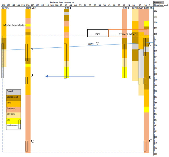 Water samples from the groundwater monitoring programme at Oslo Airport from when the airport opened in 1998 to 2019 [6] show the largest changes in water chemistry in the southwestern part of the western runway. This area receives a high load of de-icing chemicals because propylene glycol, used to de-ice the wings, sloughs off during takeoff at this part of the airport, in addition to potassium formate from runoff from the runway. The mechanical spreading of snow from the runways causes chemicals to spread about 40 m from the runway. This was documented by collecting snow at different distances from the runway in this area [15,16]. The groundwater level in the area is also relatively shallow (6–7 m below the surface). In November 2007, several monitoring wells were installed. These have been named after the first monitoring well, Br29, and form a line along what is expected to be the main direction of groundwater flow. They are named Br29-2, Br29-3, Br29-4, and Br29-5 (area indicated in Figure 1). Notice that the groundwater map and flow lines suggested by the most recent groundwater map, diverge somewhat from the line of Br29-wells shown in the groundwater map. Well logs provide a qualitative description of the stratification (Figure 3); multi-level wells were not available prior to this modelling study. The challenge with using this information to model the groundwater flow in the area was that the information is descriptive and does not provide accurate hydraulic conductivity of the layers. Well logging was carried out by different people, and it is uncertain whether the same classification was used when installing the various wells. With a groundwater table at 6–7 m depth and a total well depth of 10–15 m, there is very limited information about the groundwater zone. The entire lengths of the runways are between 3 and 4 km, illustrating the challenge of both characterising detailed hydrogeological parameters and monitoring groundwater quality.