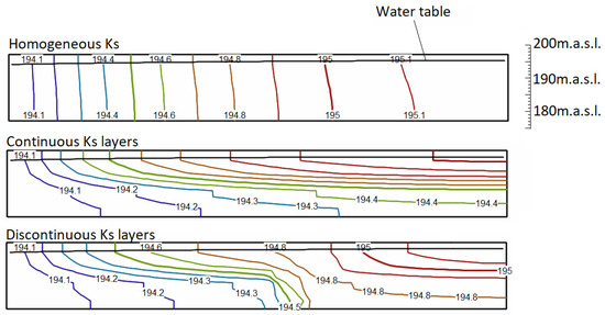 The hydraulic head distributions and water table locations for each of the scenarios (homogeneous Ks, continuous Ks layers, and discontinuous Ks layers–Model 1 are used for illustration purposes) are shown in Figure 5. While the water table remains the same, the hydraulic head equipotential lines are very differently distributed. For the homogeneous Ks case, equipotential lines are nearly vertical, and the system is dominated by horizontal flow. In the other cases, and especially with the discontinuous Ks layers, equipotential lines are highly curved, giving rise to a stronger vertical flow component.