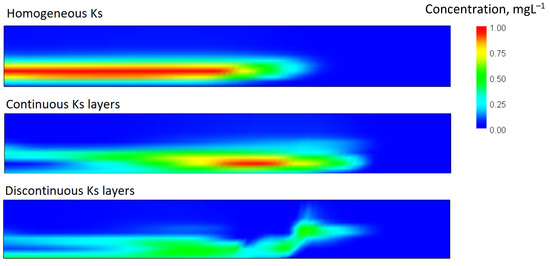 Figure 7 shows the plume distribution for the homogeneous, continuous, and discontinuous cases (Model 1 configuration), 15 years after the tracer was added. The effect of layers and lenses of varying Ks is apparent. The location of the plume and its centre of mass are strongly affected by the different Ks layers and lenses. The spread of the tracer is also slower, and the tracer seems to remain at a greater depth. In the case of discontinuous Ks layers, the tracer does not accumulate in one specific region with high concentrations but spreads out more in the deepest layers. Although it may look as if there is less tracer present in the layered systems (less red colour in Figure 7), the total mass is the same in all model realisations, indicating a larger dispersion (i.e., dilution) of the plume.