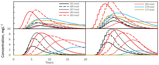 With Model 1, for both the continuous and discontinuous layers, the tracer is mainly found below 185 m.a.s.l. (locations A and B). At location B, the tracer has also spread to deeper layers (179–177 m.a.s.l.) compared to the homogeneous case. Furthermore, the maximum concentration at different depths occurs at different times. In the cases of discontinuous layers, the amount of tracer that reaches the deepest layer (177 m.a.s.l.) has also increased.