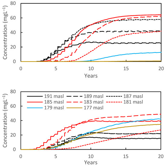 When the tracer is added recurrently each year, there is a build-up of the tracer in specific layers (Figure 9). When layers with different Ks are discontinuous, most of the tracer accumulates in the deepest layers (185–177 m.a.s.l.). With the homogeneous Ks case, less tracer accumulates at depth and more in the shallow part of the aquifer. The tracer concentrations reach a steady-state value at which the concentration no longer increases. However, the concentration in the deepest layers is still increasing after 20 years, particularly in the case of the discontinuous Ks layer.