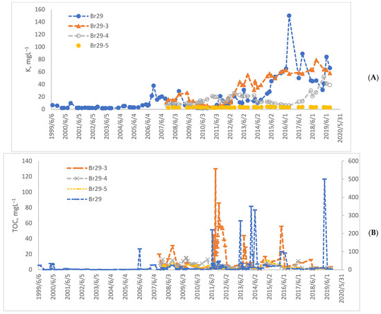Observed concentrations from 1999 to 2019 of (A) potassium (K) and (B) total organic carbon (TOC) in monitoring well Br29 shown on the secondary y-axis and wells Br29-3, Br29-4, and Br29-5 on the primary y-axis (for distance from runway see Figure 3), wells from Br29-3 to Br29-5 were installed in 2007.