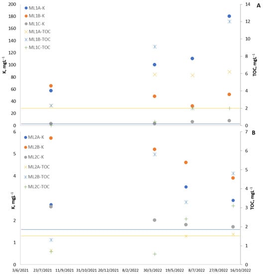 Concentrations of potassium (K, left y-axis) and total organic carbon (TOC, right y-axis) in water sampled at three depths of the multilevel samplers (Figure 3), (A) ML1 at 10 m and (B) ML2, installed at 10 and 130 m from the runway, respectively. Maximum background concentrations of K are indicated as blue straight lines, and the equivalent for TOC as yellow lines.