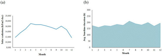 Monthly solar radiation (a) and averaged sunshine duration (b) of southwest of Taiwan.