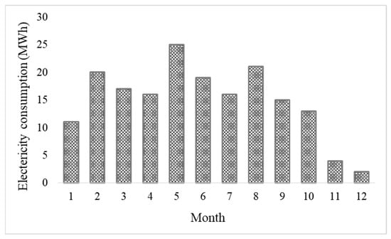 For the pacific white shrimp, the nursery and grow-out periods cover around 90 days. The shrimp larvae are first reared in the indoor nursery tank with bottom aeration. This phase requires around 20–30 days before the juvenile shrimp are transferred to the full-size grow-out pond. The grow-out pond must have constant surface and bottom aeration [49]. A single 3400 m2 pond uses an average of 16 MWh/month of energy during the growing stage. Figure 5 shows the typical monthly pattern of electrical energy use.