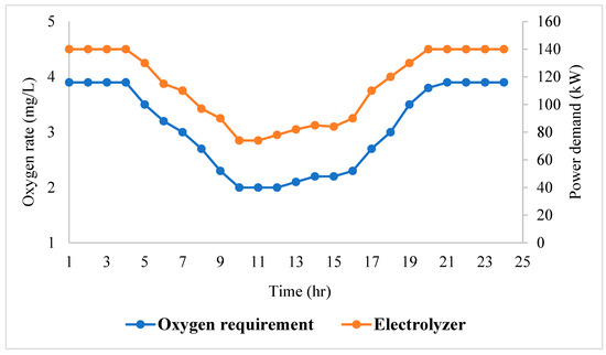 The amount of oxygen that is required to maintain life in the grow-out ponds with the biophysical qualities that are specified in Table 1 determines how effectively the electrolyzer will perform. The power consumption of the electrolyzer is governed by the oxygen losses that are caused by the organisms in the grow-out ponds, as well as the oxygen that is generated by photosynthesis in the ponds. As a result, the electrolyzer’s electrical consumption varies during the day, peaking at night due to the drop in oxygen generated by photosynthesis (Figure 6).