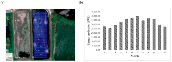 Mono-pitch farm canopy without shading effects at an optimum tilt of 10° (a) and the monthly energy production (kWh) of the study site (b).