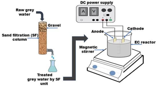 From a technical point of view, sand filtration is a physical treatment process, which has been conducted by many researchers as a sole treatment process with great potential for greywater treatment [25,26,27,28]. However, a large area for treatment may be required for SF treatment. Furthermore, the effluent from SF treatment might need a disinfection process. On the other hand, the EC process does not require a large area for treatment, unlike the use of sand filtration technology.
