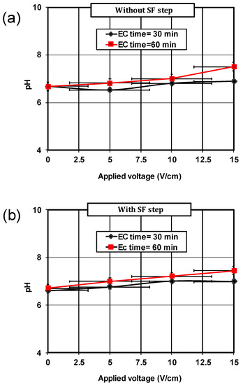 Evolution of pH during EC time: (a) without SF step, and (b) with SF step.