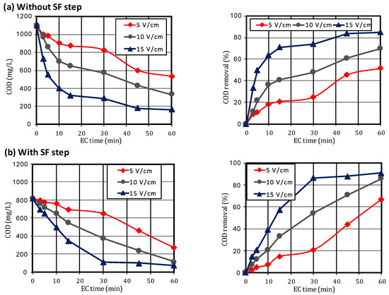 After applying the EC treatment to greywater samples without the SF pretreatment step, the COD in the raw greywater was reduced from 1102 mg/L to 532 (51.7%), 332 (69.9%), and 165 (85.0%) at the applied voltage gradients of 5 V/cm, 10 V/cm, 15 V/cm, respectively, during 60 min of EC time. In addition, the performance of EC with respect to COD removal increased after applying the SF pretreatment step, reducing COD from 821 mg/L to 272 mg/L (66.9%), 116 (85.9%), and 77 (90.6%) at the applied voltage gradients of 5 V/cm, 10 V/cm, 15 V/cm, respectively, during 60 min of EC time. However, if we account for the COD removed by both units (SF–EC) based on the initial concentration of COD before SF pretreatment (1102 mg/L), the overall removal of COD was 75.3%, 89.5%, and 93.0% at the applied voltage gradients of 5 V/cm, 10 V/cm, 15 V/cm, respectively. Apparently, the SF step reduced the organic load in the EC unit, which enabled increasing percentages of removal at all applied voltage gradients.