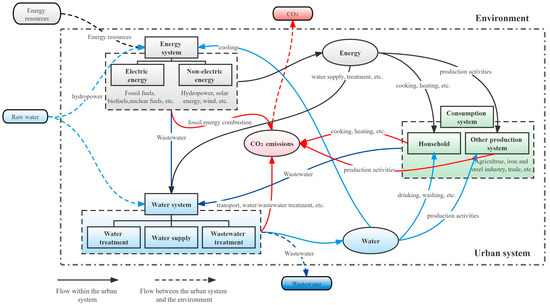 The urban systems are regarded as spaces where human beings closely relate to the natural world and living and nonliving elements coexist and interact with each other [1]. In urban systems, water is an essential resource for human beings, as it provides the necessary guarantee for social production and human survival [2]. Additionally, human activities, such as fossil energy combustion, water supply, and wastewater treatment will cause large CO2 emissions and climate deterioration, which in turn lead to water shortages [3]. However, from the perspective of urban metabolism, urban systems can be unsustainable because of dependence on material and energy importation to sustain themselves and to export waste to the ecosystems [1]. The unsustainability, together with the unavoidability of both water consumption and carbon emissions in urbanization, make the water–carbon coordination significant for the sustainable development of cities.