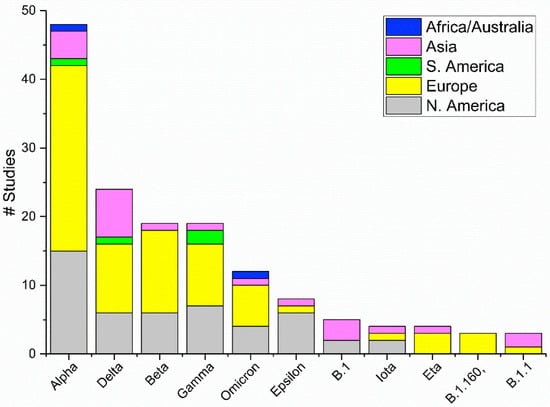 - Hodcroft, E.B.; Zuber, M.; Nadeau, S.; Vaughan, T.G.; Crawford, K.H.D.; Althaus, C.L.; Reichmuth, M.L.; Bowen, J.E.; Walls, A.C.; Corti, D.; et al. Spread of a SARS-CoV-2 Variant through Europe in the Summer of 2020. Nature 2021, 595, 707–712. [Google Scholar] [CrossRef]