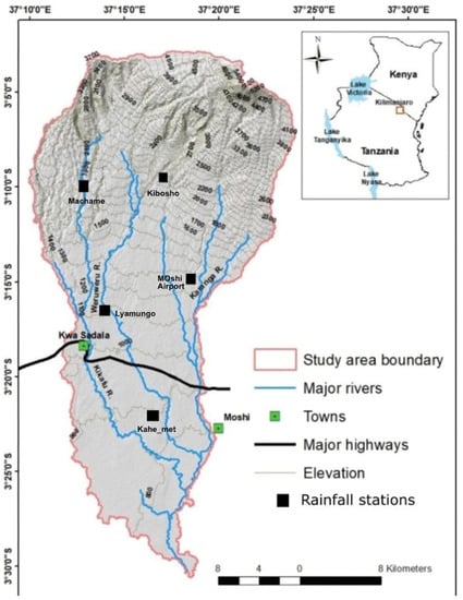 The study area under consideration is situated in the northern part of Tanzania in the south of the Kilimanjaro region. The Karanga–Weruweru–Kikafu (KWK) sub-catchment (Figure 1) and the villages along the Kikuletwa river are intensely affected by flash river floods from heavy rainfall. The aim of this work was to classify rainfall intensity among three classes (heavy, light, none). The categories are based on the rate of precipitation per period, with precipitation of more than 64.5 mm in a day classified as heavy, anything below that up to precipitation greater than zero (0) millimeters per day classified as light rain, and 0.00 classified as no rain. Data records for the study covering the period from 1979 to 2014 was provided by Tanzania Meteorological Agency (TMA), and the Pangani Basin Water Board(PBWB).