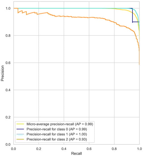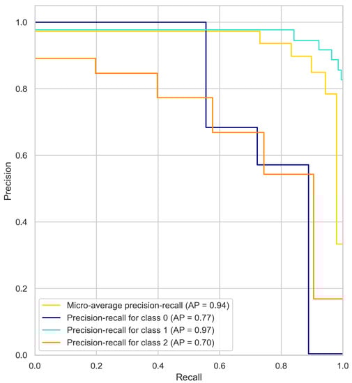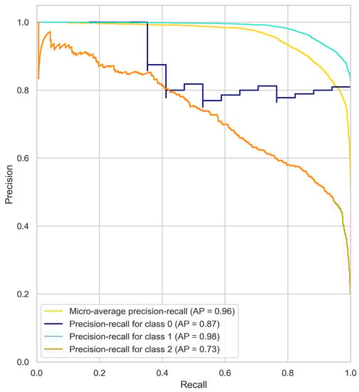 First, Figure 2 shows a precision–recall curve for a support vector machine in which the PR curve for the heavy rain class (class 0) is slightly below the micro-average PR curve, indicating a lower precision value for this class. The PR curve for the light rain class (class 1) is higher than both the micro-average PR curve and the PR curve for the heavy rain class, indicating high precision and recall values for this class. The PR curve for the no rain class (class 2) is below the micro-average PR curve and the PR curve for the light rain class, indicating relatively low precision and recall values for this class. Overall, the micro-average PR curve is high, with an AP value of 0.96, indicating a high level of precision and recall across all three classes.