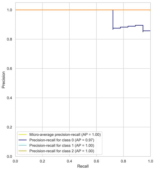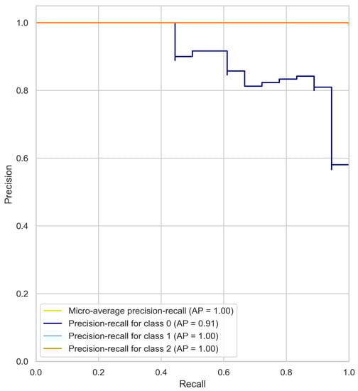 In addition to the overall AUC, the shape and position of the curve can also provide insights into the performance of the classifier. A curve that is close to the top-right corner of the plot indicates a classifier with high precision and high recall, whereas a curve that is close to the bottom-left corner indicates a classifier with low precision and low recall. The shape of the curve can also reveal whether the classifier is biased towards precision or recall, which can inform the selection of a decision threshold that balances the two []. In Figure 2, Figure 3, Figure 4, Figure 5 and Figure 6, we show the precision–recall curves for each of the considered classification algorithms.