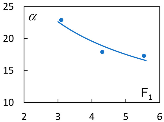 Leutheusser and Fan (2001) [8] determined values of α that provided good agreement between the surface velocity measurements and those predicted by the forced vortex equations for only three tests conducted at F1 = 3.1, 4.3, and 5.5. To enable general application to other flow conditions, Figure 6 shows that the test data fit well to the relation α = 39.2(F1)−0.5.
