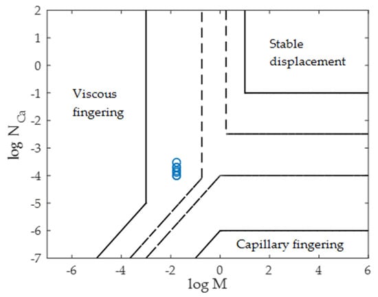Figure 4 shows the logNCa vs. logM phase diagram and the flow conditions correspond to the reported experiments. M is the viscosity ratio of the invading fluid (air) to the defending fluid (liquid), which is 1.8 × 10−2 in this work. The logNCa vs. logM phase diagram shows that bubble flow conditions in all experiments are in the viscous fingering regime for flow in micromodels. Viscous fingering is the formation of finger-like instabilities at the interface of two fluids during the displacement of a high-viscosity resident fluid by injecting low-viscosity fluid, particularly in a porous medium [43,44,45,46]. When a fluid displaces another fluid with a higher viscosity, the displacing fluid moves more easily than the displaced one and tends to penetrate the high-viscosity fluid, at last intruding into it in the form of fingers. In our experiments, the displacing fluid air bubbles have a viscosity of 1.8 × 10−5 Pa·s, which is much smaller than the viscosity of water (i.e., 1 × 10−3 Pa·s). Viscous fingering is mainly caused by the local pressure difference created by the perturbation at the interface of displacing fluid and displaced fluid [47]. With the local increase in fluid speed and pressure gradients, it forces fingers to grow and expand.