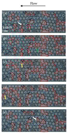 The movement of bubble in porous media was investigated with visual data. Figure 5 presents five snap shots where the flow with bubbles transport through a 0.8 mm height channel. As indicated, the bubble flow direction is from right to left. We focused on examining a part of microchannel field close to the inlet, and the images were taken every two seconds from 2:57 min to 3:05 min after the test started. Figure 5a presents the distribution of several trapped bubbles in the field of view, which were previously formed during the experiment. These trapped bubbles blocked the pore spaces and created certain preferential pathways for air flow. Several bubbles had just entered the area of the view from the right side. In Figure 5b, as new incoming bubbles entered the field of view from right side, the expansion of areas with trapped bubbles was observed. Some small bubble area was generated in situ around the area of air bubbles as the injected bubbles flowed through. Examples of such bubbles are indicated by the yellow arrows in Figure 5. Two areas marked by blue dashed squares showed some interesting patterns of bubble displacement. As moving bubbles entered the area, they tended to follow the pathway as previously trapped bubbles. Therefore, as time went on, trapped bubbles were expanded in the direction of flow. After the moving bubble left the area, the trapped bubbles were left behind (Figure 5d,e). The observation is consistent with viscous fingering: incoming bubbles followed the pathway connecting those trapped bubbles and coalesced with them. Finally, as some bubbles moved out of the field of view (Figure 5e), the large, trapped bubbles (bubbles numbered with 1 and 2 in Figure 5) remained stationary and stayed at their original place from before the bubble entered. This is due to the Jamin effect, which is the presence of these bubbles blocking the flow pathway [50]; therefore, the driving force provided by the syringe pump is not enough to reach the critical pressure that it is necessary to push large bubbles through the pore throat.