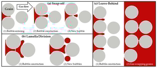 Three mechanisms of in situ bubble generation: (a) snap-off; (b) lamella division; and (c) leave-behind. The red region indicates the gas phase. Adapted with permission from Abdelgawad et al. [54]. 2022, Elsevier.