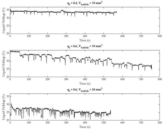 The change in liquid holdup over the time in the 0.6 mm channel under three flow conditions.