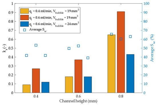We further analyzed the trend of water saturation during transport experiments for each channel height. As shown in Figure 9, relative permeability values highly depend on the degree of average water saturation. For both the 0.6 mm and 0.4 mm channels, higher water saturation led to higher relative permeability. This is consistent with the typical water saturation and relative permeability relationship [57,58]. In the 0.8 mm channel with 19 mm3 bubble size, however, the two experiments with different water flow rates have about the same water saturation close to 60%, but the experiment with higher water flow rate (ql = 0.6 mL/min) has a larger relative permeability than the experiment with a lower water flow rate (ql = 0.4 mL/min). This indicates that although relative permeability is dependent on the water saturation, the relationship is not linear. Under a similarly high saturation condition, higher water flow has a higher water relative permeability.