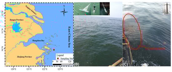 The sampling site for our study is located at the Zhoushan Fishing Ground in the East China Sea (Figure 1A). As the most well-known and extensive fishing ground in China, this region boasts abundant marine resources and intensive fishing activities. Additionally, the Zhoushan Fishing Ground is situated near the highly populated cities of Shanghai and Zhejiang Province and is impacted by land-based plastic and MP waste exportation from the Yangtze River Estuary and the Qiantangjiang Estuary, both of which are significant sources of plastic waste []. Given these factors, the Zhoushan Fishing Ground serves as an ideal location to study the methodology of MPs and provides valuable baseline data and reference for MPs data compiled in the area.