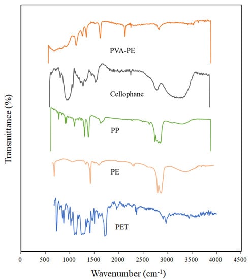 To identify their chemical composition, plastics larger than 1 mm were identified using a Fourier transform infrared spectrometer (Thermo Fisher Scientific Nicolet iS5, Waltham, MA, USA) equipped with an iD7 type attenuated total reflection probe, while plastics smaller than 1 mm were identified using micro-Fourier transform infrared spectrometer in transmission mode (micro-FTIR, Thermo Scientific iN10 MX). Each scan was accumulated as the average of 32 scans in the spectral range of 600–4000 cm−1 at a resolution of 4 cm−1. Each spectrum was compared against a database from ThermoFisher (OMNIC Picta) to verify the polymer type. Matching spectra with a quality index above 70% were accepted. Individual FTIR spectra of MPs do not demonstrate any characteristics correlated with sampling conditions, including sampling depth, sampling methods, etc. Representative FTIR spectra of MPs extracted from the samples are shown in Figure 2.